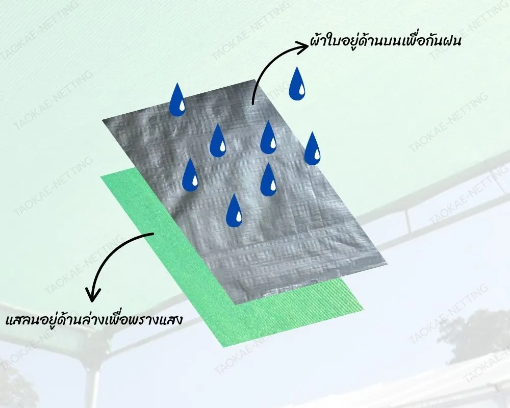- ใช้แสลนร่วมกับ ผ้าใบพลาสติก PE: แสลนอยู่ด้านล่างเพื่อพรางแสง, ผ้าใบอยู่ด้านบนเพื่อกันฝน